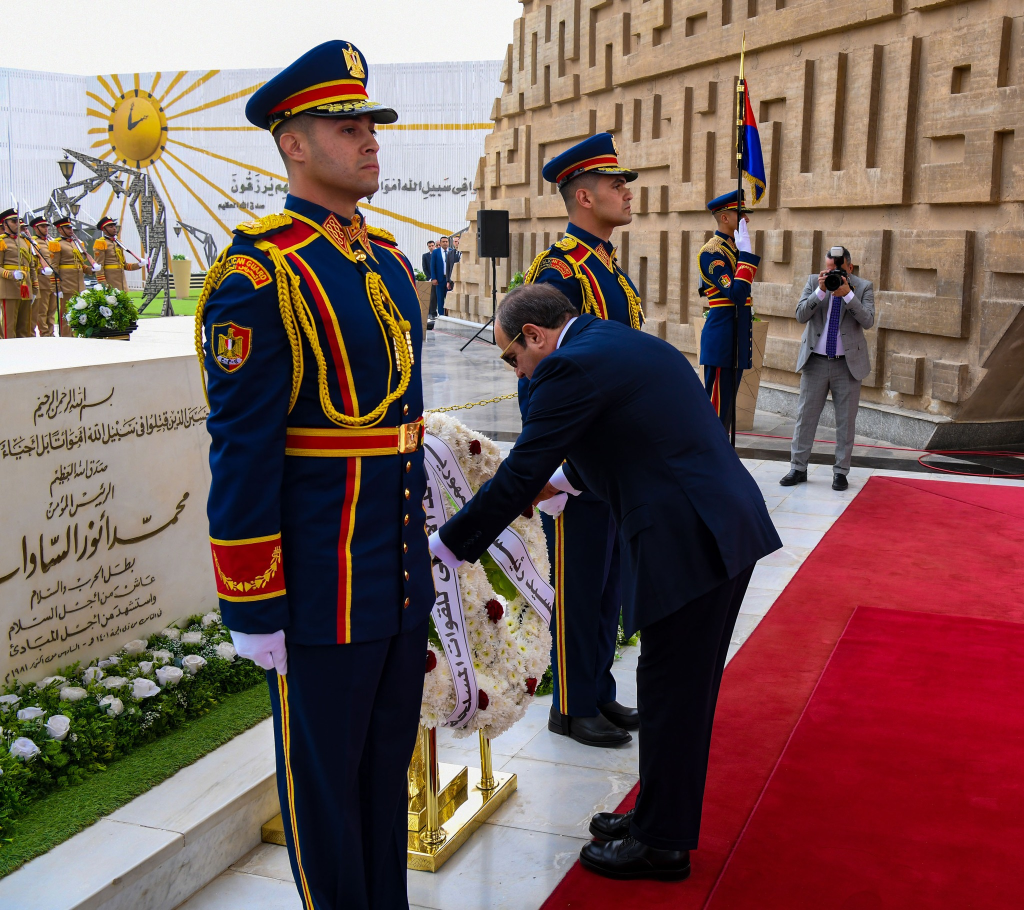 ثم توجه الرئيس / السيسى إلى قبر الزعيم الراحل / محمد أنور السادات ، وقام بوضع إكليل من الزهور وقراءة الفاتحة ترحماً على روحه الطاهرة .