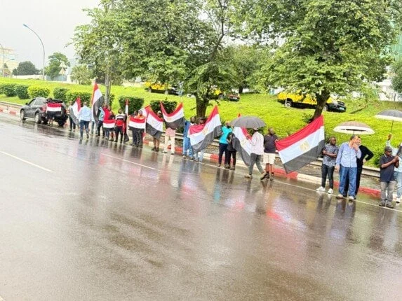- تجمع عدد من المصريين العاملين في غينيا والمواطنين الغينيين أمام مطار مالابو لتقديم التحية والترحيب بالرئيس، حيث رفعوا أعلام مصر وصور الرئيس.
