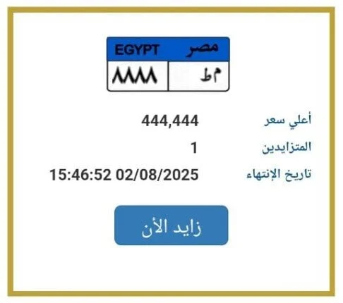 أعلنت بوابة مرور مصر الإلكترونية عن بدء المزايدة على لوحة معدنية مميزة للسيارات، والتي بلغ سعرها حتى الآن 444 ألف جنيه، وتحمل الرقم «م ط 8888». وتستمر المزايدة على اللوحة بالإضافة إلى شخص واحد يتنافس حتى الآن، مع انتهاء المزايدة غدًا السبت الموافق 2 أغسطس 2025.