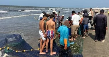 صيادو بورسعيد يلقون شبكاتهم على الشاطئ لصيد الأسماك.. صور