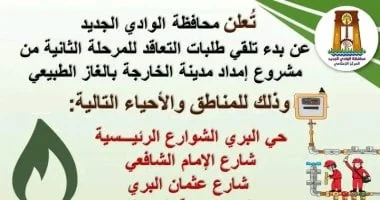 تبدأ محافظة الوادي الجديد في تلقي طلبات التعاقد لتوصيل الغاز الطبيعي في المرحلة الثانية لمنطقة حي البري، والشوارع الرئيسية ومنها شارع الإمام الشافعي، وشارع عثمان البري، وشارع مكتبة اليوسف. ويُطلب من المواطنين المقيمين بتلك المناطق الراغبين في الاشتراك في خدمة الغاز التوجه إلى مقر خدمة العملاء المختص بذلك. وتُشدد المحافظة على ضرورة إرفاق المستندات المطلوبة والتي تشمل صورتين واضحة وسارية من بطاقة الرقم القومي، وإيصال كهرباء حديث باسم مقدم الطلب، بالإضافة إلى نسخة من عقد الإيجار المفعول أو عقد التمليك للوحدة السكنية.