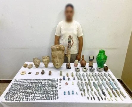 - القطع المضبوطة تشمل تماثيل، تمائم، رأس تمثال، أواني، عملات معدنية، مجسمات فخارية وغيرها.