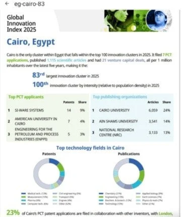 - سجَّلت القاهرة المركز 83 ضمن أكبر 100 كتلة ابتكار عالميًا، مرتفعة من المركز 95 في 2024.