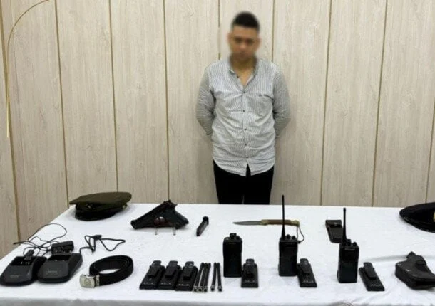 - بحوزة المتهم: سيارة، طبنجة صوت معدلة، 3 أجهزة لاسلكية خاصة بأفراد الأمن الإداري، قيد حديدي، و2 صورة بطاقة قومية مزورتان.