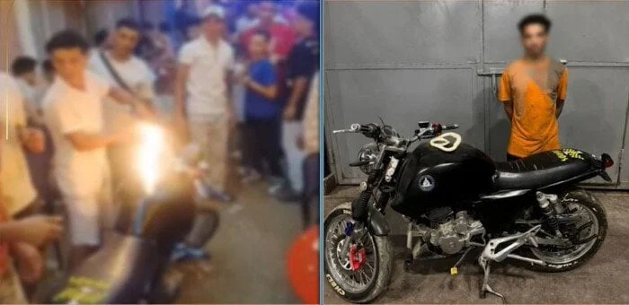 - المقطع المتداول يظهر قائد دراجة نارية يفتح غطاء الوقود ويشعل النيران فيه احتفالاً بزفاف، مما عرض حياته ومحيطه للخطر.
