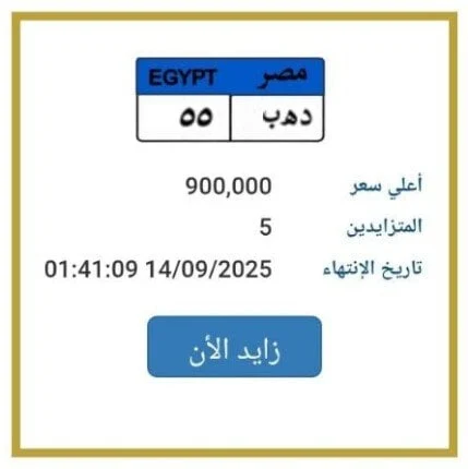 تتيح بوابة مرور مصر الإلكترونية خيار المزاد على لوحة معدنية مميزة للسيارات، حيث بلغ سعرها 900 ألف جنيه وتحمل الرقم «د ه ب 55»، ويشارك في المزاد حتى الآن 5 أشخاص. من المقرر أن تنتهي المزايدة يوم الأحد 14 سبتمبر 2025.