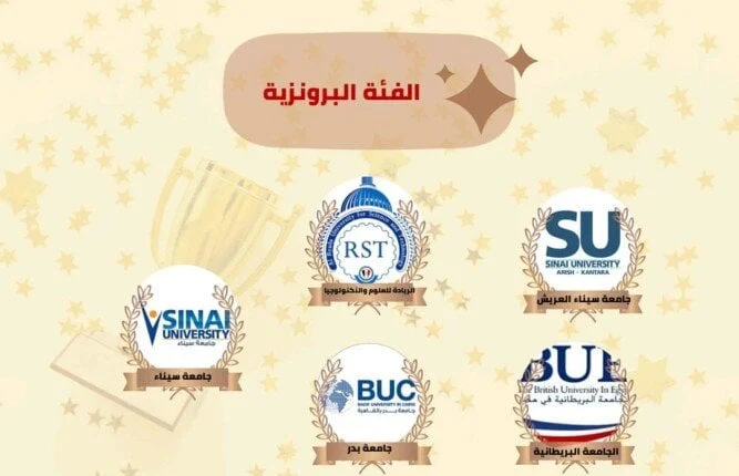 وفيما يخص الجامعات الخاصة فقد جاءت جامعة أكتوبر للعلوم الحديثة والآداب والجامعة الألمانية بالقاهرة والجامعة المصرية الروسية وجامعة فاروس في الفئة الذهبية، بينما جاءت جامعة 6 أكتوبر والجامعة المصرية الصينية في الفئة الفضية، وضمت الفئة البرونزية جامعات سيناء العريش والريادة للعلوم والتكنولوجيا والبريطانية وبدر وسيناء.