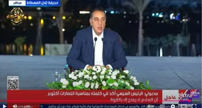 في تصريحات رسمية، أكد الدكتور مصطفى مدبولي رئيس الوزراء أن الرئيس عبد الفتاح السيسي قال في كلمته بمناسبة ذكرى أكتوبر: السلام لا يمنح إلا بالقوة. وأوضح مدبولي، خلال المؤتمر الصحفي الذي عقد اليوم في حديقة تلال الفسطاط ونقلته قناة إكسترا نيوز، أن هذه الكلمة حملت رسائل قوية ومباشرة تعكس عمق الرسالة الوطنية في هذه المناسبة.