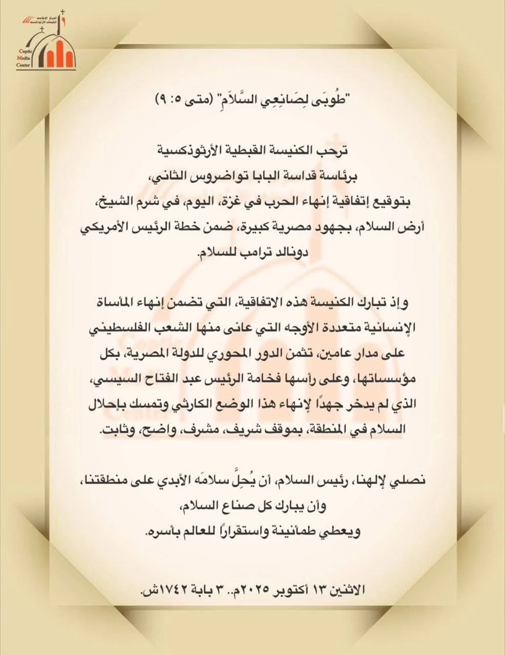 رحبت الكنيسة القبطية الأرثوذكسية، برئاسة قداسة البابا تواضروس الثاني، بتوقيع اتفاقية إنهاء الحرب في غزة، والتي عُقدت في مدينة شرم الشيخ، أرض السلام، ضمن الجهود المكثفة التي قادتها مصر بالتعاون مع الولايات المتحدة الأمريكية في إطار خطة الرئيس الأمريكي دونالد ترامب للسلام.