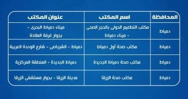 – مكتب التطعيم الدولي بالحجر الصحي: ميناء دمياط البحري بجوار غرفة الملاحة