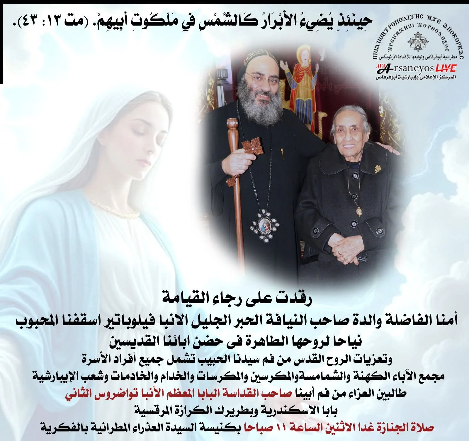 موقع «أبو الهول» ينعى نيافة الأنبا فيلوباتير في وفاة والدته