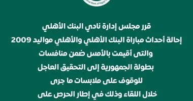 أعلن مجلس إدارة البنك الأهلي إحالة أحداث مباراة البنك الأهلي والأهلي مواليد 2009 التي أقيمت أمس ضمن منافسات بطولة الجمهورية إلى التحقيق العاجل للوقوف على الملابسات. وذلك في إطار الحرص على ترسيخ قيم الانضباط والروح الرياضية وبما يحفظ العلاقات القوية بين الناديين. سيشارك في التحقيق جميع الأطراف المعنية والجهات المختصة، وسيتم الإعلان عن نتائجه عند الانتهاء من الإجراءات اللازمة. تؤكد الإدارة أن الهدف الأساسي هو تعزيز الشفافية وتطبيق اللوائح بشكل عادل للجميع.