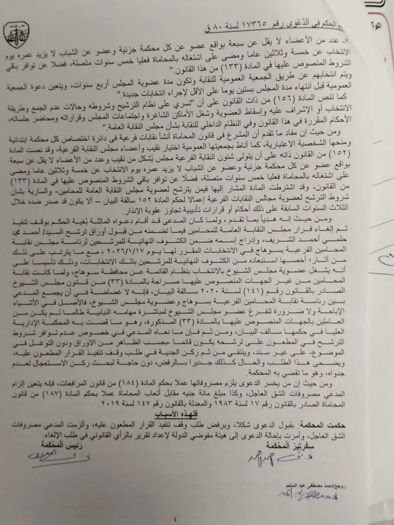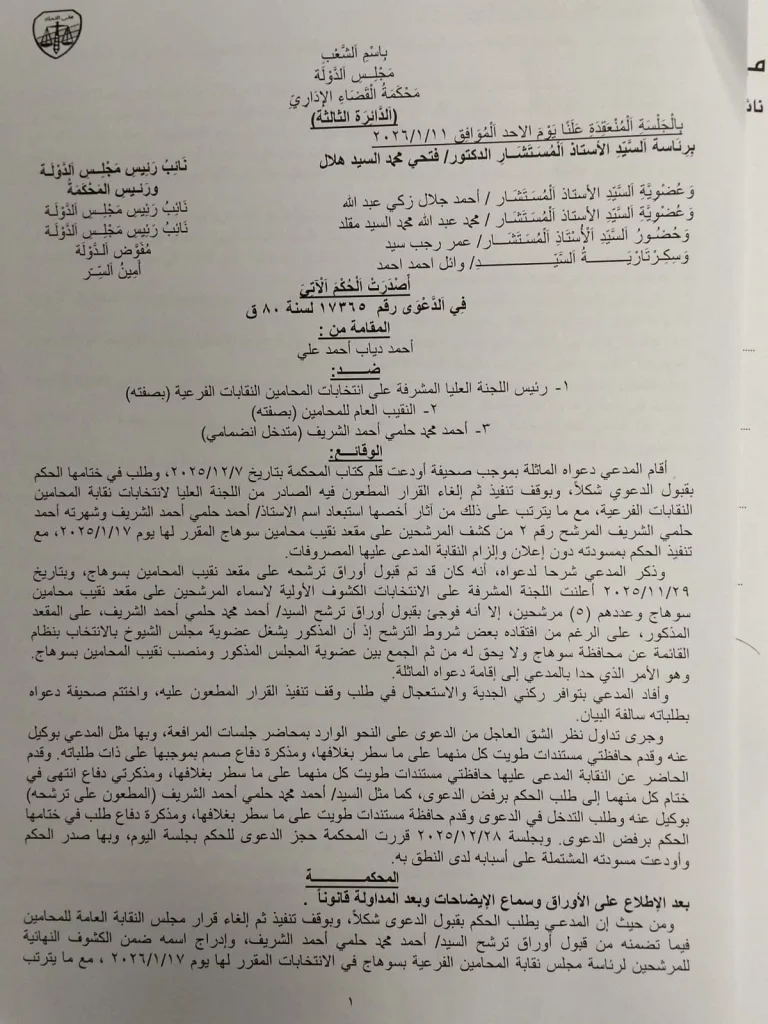 قضت محكمة القضاء الإداري بمجلس الدولة (الدائرة الثالثة)، برفض طلب وقف تنفيذ القرار الصادر بقبول ترشح المحامي أحمد محمد حلمي أحمد الشريف على مقعد نقيب محامي سوهاج، وذلك في الانتخابات المقرر إجراؤها يوم 17 يناير 2026.