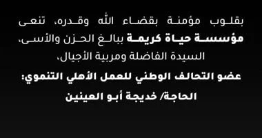 تعلن مؤسسة حياة كريمة عن خالص تعازيها للنائب محمد أبو العينين ولأسرته في وفاة شقيقة النائب. تدعو الله أن يتغمدها بواسع رحمته ويسكنها فسيح جناته جزاءً لما قدمته من خدمة في مجال العلم والتربية. وتعرب عن صبر وسلوان أهلها وذويها في هذا المصاب. كما تؤكد تقديرها لدورها وخدماتها في خدمة المجتمع.