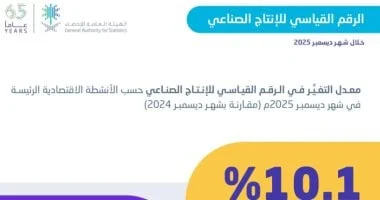 أعلنت الهيئة العامة للإحصاء أن الرقم القياسي العام للإنتاج الصناعي ارتفع بنسبة 8.9% على أساس سنوي مدعومًا بارتفاع نشاط التعدين واستغلال المحاجر ونشاط الصناعة التحويلية وإمدادات المياه وأنشطة الصرف الصحي وإدارة النفايات ومعالجتها. جاء ذلك وفق النشرة الشهرية لإنتاج الصناعي لشهر ديسمبر 2025، التي توضح التغيرات في كميات الإنتاج على مستوى الأنشطة الاقتصادية. أظهرت النتائج ارتفاع الرقم القياسي الفرعي لنشاط التعدين واستغلال المحاجر بنسبة 13.2%، كما ارتفع الرقم القياسي الفرعي لنشاط الصناعة التحويلية بنسبة 3.2%، وارتفع الرقم القياسي الفرعي لنشاط إمدادات المياه وأنشطة الصرف الصحي وإدارة النفايات ومعالجتها بنسبة 9.4%. في المقابل سجل الرقم القياسي الفرعي لإمدادات الكهرباء والغاز والبخار وتكييف الهواء انخفاضًا سنويًا قدره 2.5%.