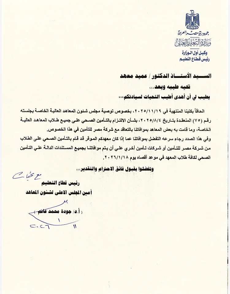 ج: صدر خطاب لاحق بتاريخ 11 يناير الماضي تراجع عمليًا عن فكرة الإلزام بشركة واحدة، وطلب فقط موافاة المجلس بموقف التأمين لدى كل معهد، سواء مع شركة مصر للتأمين أو غيرها، مع إرسال المستندات الدالة على ذلك قبل 18/1/2026. وهذا يُفهم منه أن محاولة الإلزام الأولى لم تنجح.