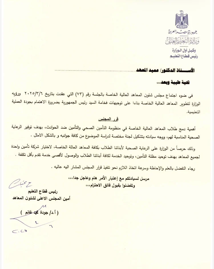 ج: البداية كانت بخطابات صادرة عن القائم بعمل رئيس قطاع التعليم، والقائم أيضًا بعمل أمين مجلس شؤون المعاهد، تؤكد موافقة الوزير السابق على فكرة التأمين الصحي الموحد، بعد عرضها في اجتماع المجلس بتاريخ 6 مارس 2025. الفكرة في ظاهرها تنظيمية: توحيد مظلة التأمين واختيار شركة واحدة لجميع المعاهد.