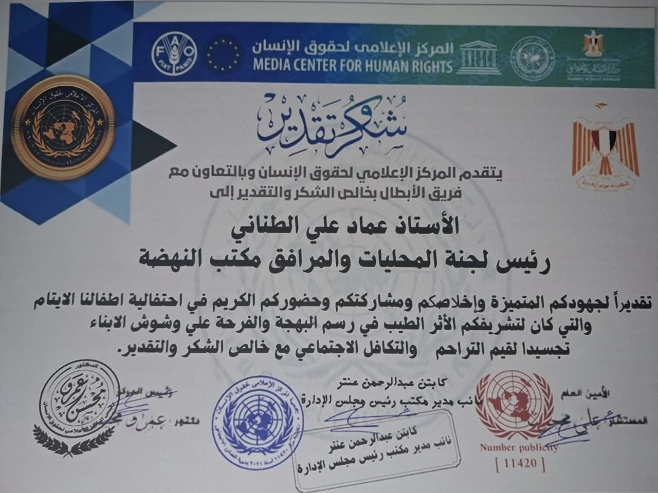 تكريم عماد الطناني في احتفالية إنسانية لأيتام المنصورة برعاية المركز الإعلامي لحقوق الإنسان