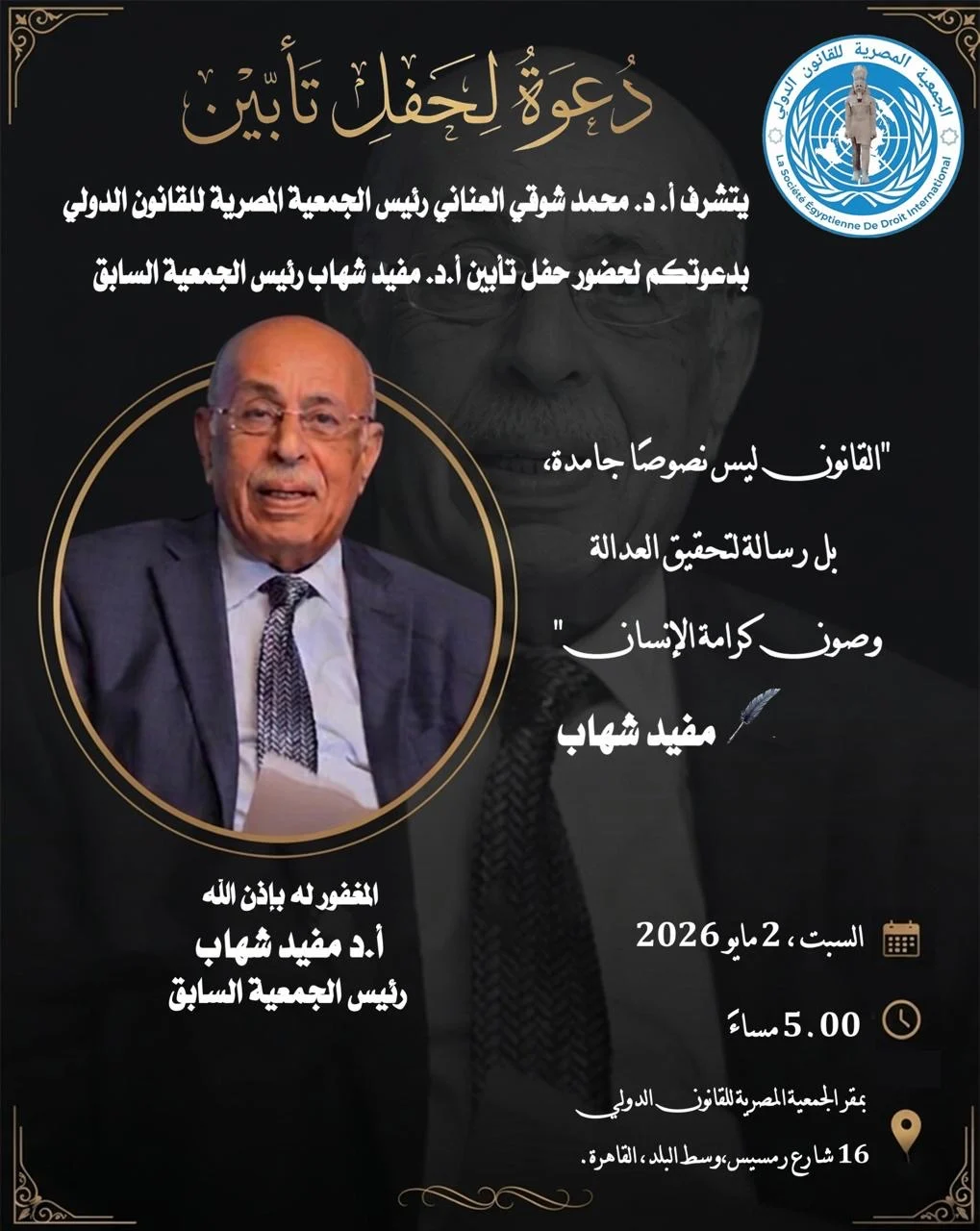 ومن المقرر أن يُقام حفل التأبين في تمام الساعة الخامسة مساء يوم السبت الموافق 2 مايو 2026، وذلك بمقر الجمعية المصرية للقانون الدولي الكائن في 16 شارع رمسيس بمنطقة وسط البلد في القاهرة، بحضور نخبة من كبار رجال القانون والقضاء، وأساتذة الجامعات، وعدد من الشخصيات العامة والدبلوماسية، إلى جانب تلامذة ومحبي الراحل.