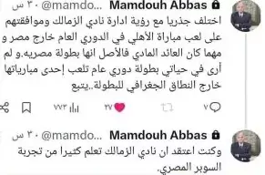 ومنذ ذلك التاريخ وجه عباس عدة رسائل شديدة اللهجة لمجلس إدارة نادي الزمالك عبر حسابه الشخصي على موقع التواصل الإجتماعي “إكس” -تويتر سابقا – منتقدًا بعض الأمور وموجهًا اللوم ليس لحسين لبيب فقط ولكن لبعض أعضاء مجلس والجهاز الفني والإداري.