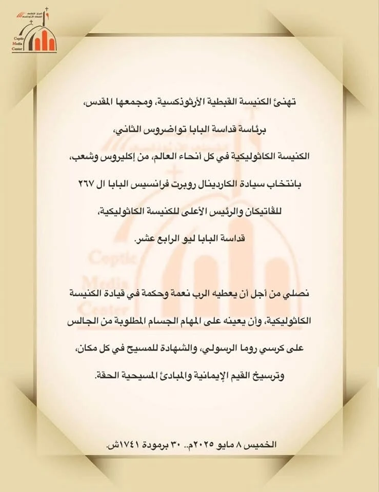 وجاء هذا التعبير الرمزي في إطار بيان رسمي صدر عن الكنيسة القبطية الأرثوذكسية، ومجمعها المقدس، برئاسة قداسة البابا تواضروس الثاني، حيث عبّرت الكنيسة عن تهنئتها القلبية للكنيسة الكاثوليكية وشعبها وإكليروسها في جميع أنحاء العالم، بهذه المناسبة التاريخية، متمنية لقداسته النجاح في قيادة الكنيسة الكاثوليكية وسط تحديات العصر.