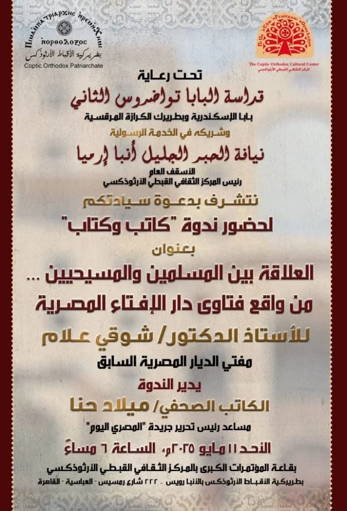 في إطار جهوده المستمرة لدعم الوحدة الوطنية وتعزيز ثقافة الحوار، ينظم المركز الثقافي القبطي الأرثوذكسي غدًا الأحد 11 مايو 2025 ندوة فكرية متميزة بعنوان: “العلاقة بين المسلمين والمسيحيين… من واقع فتاوى دار الإفتاء المصرية”، وذلك بمقره داخل الكاتدرائية المرقسية بالعباسية، في تمام الساعة السادسة مساءً. الدعوة مفتوحة للجميع.
