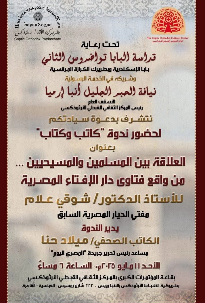 الندوة تقام تحت رعاية قداسة البابا تواضروس الثاني بابا الإسكندرية وبطريرك الكرازة المرقسية، وبالشراكة مع نيافة الأنبا إرميا الأسقف العام، رئيس المركز الثقافي القبطي الأرثوذكسي، والأمين العام المساعد لبيت العائلة المصرية، الذي يُعد واحدًا من أبرز الرموز الوطنية التي تعمل بإخلاص لترسيخ مبادئ المواطنة والتعايش المشترك.