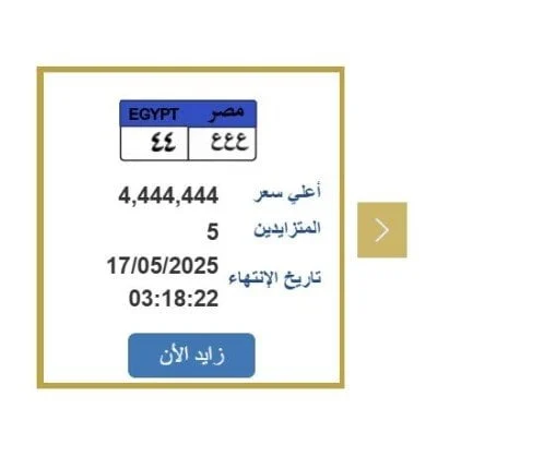أعلنت بوابة مرور مصر الإلكترونية عن عرض مزايدة على لوحة معدنية مميزة للسيارات، حيث وصل سعرها إلى 4 ملايين و444 ألف جنيه، وتحمل رقم “ع ع ع 44”. يتزايد عدد المهتمين بالمزايدة والتي من المقرر أن تنتهي يوم السبت الموافق 17 مايو 2025. لذلك، تبحث الكثير من الأشخاص عن خطوات الحصول على لوحة سيارات مميزة.