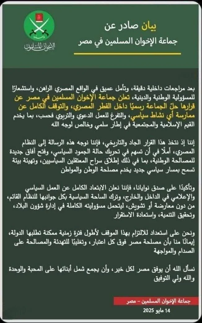أصدرت جماعة الإخوان المسلمين في مصر بيانًا صحفيًا تعلن فيه حلّ الجماعة رسميًا داخل البلاد، والتوقف الكامل عن ممارسة أي نشاط سياسي، والتفرغ للعمل الدعوي والتربوي، بما يخدم القيم الإسلامية والمجتمعية.